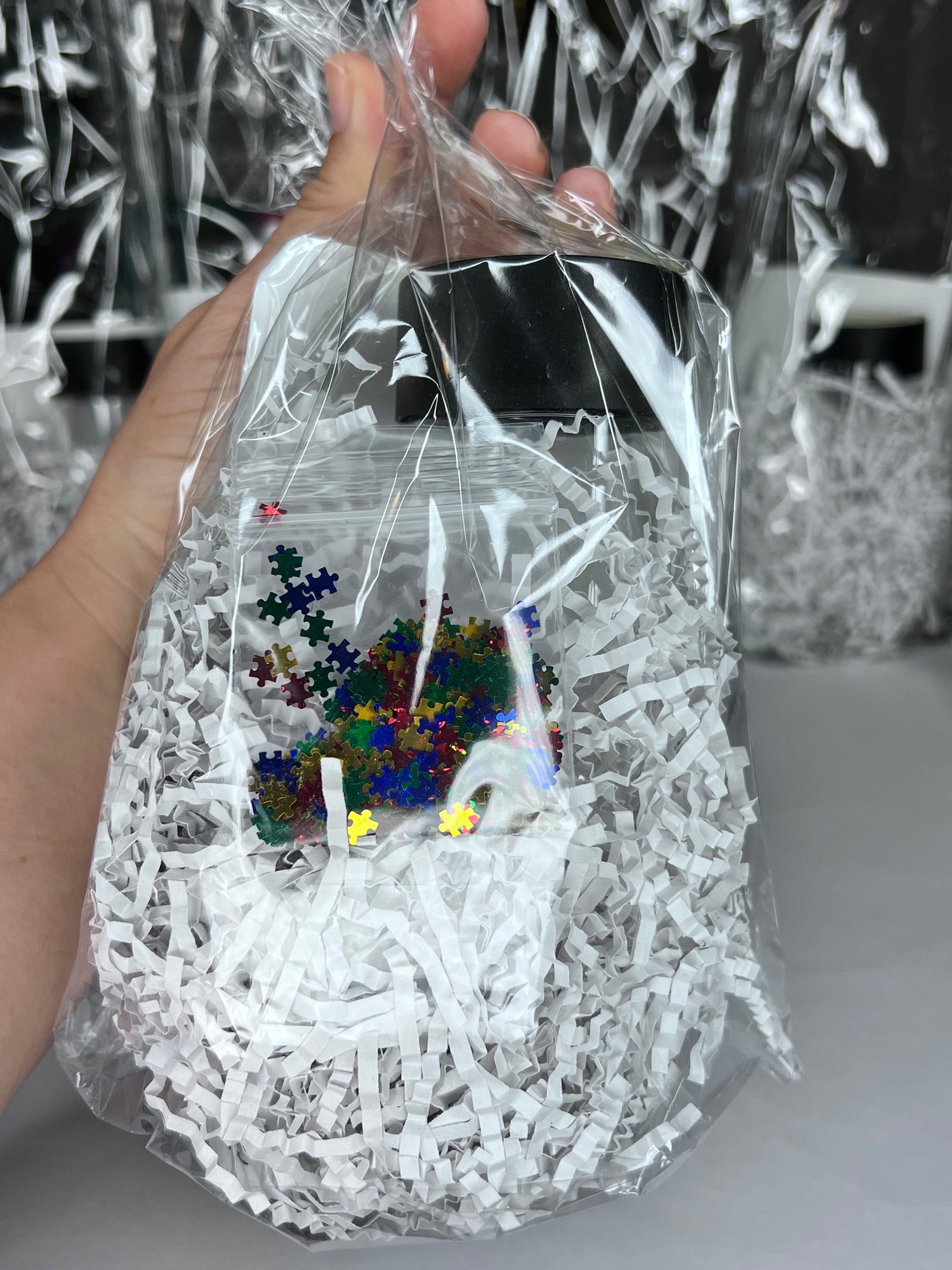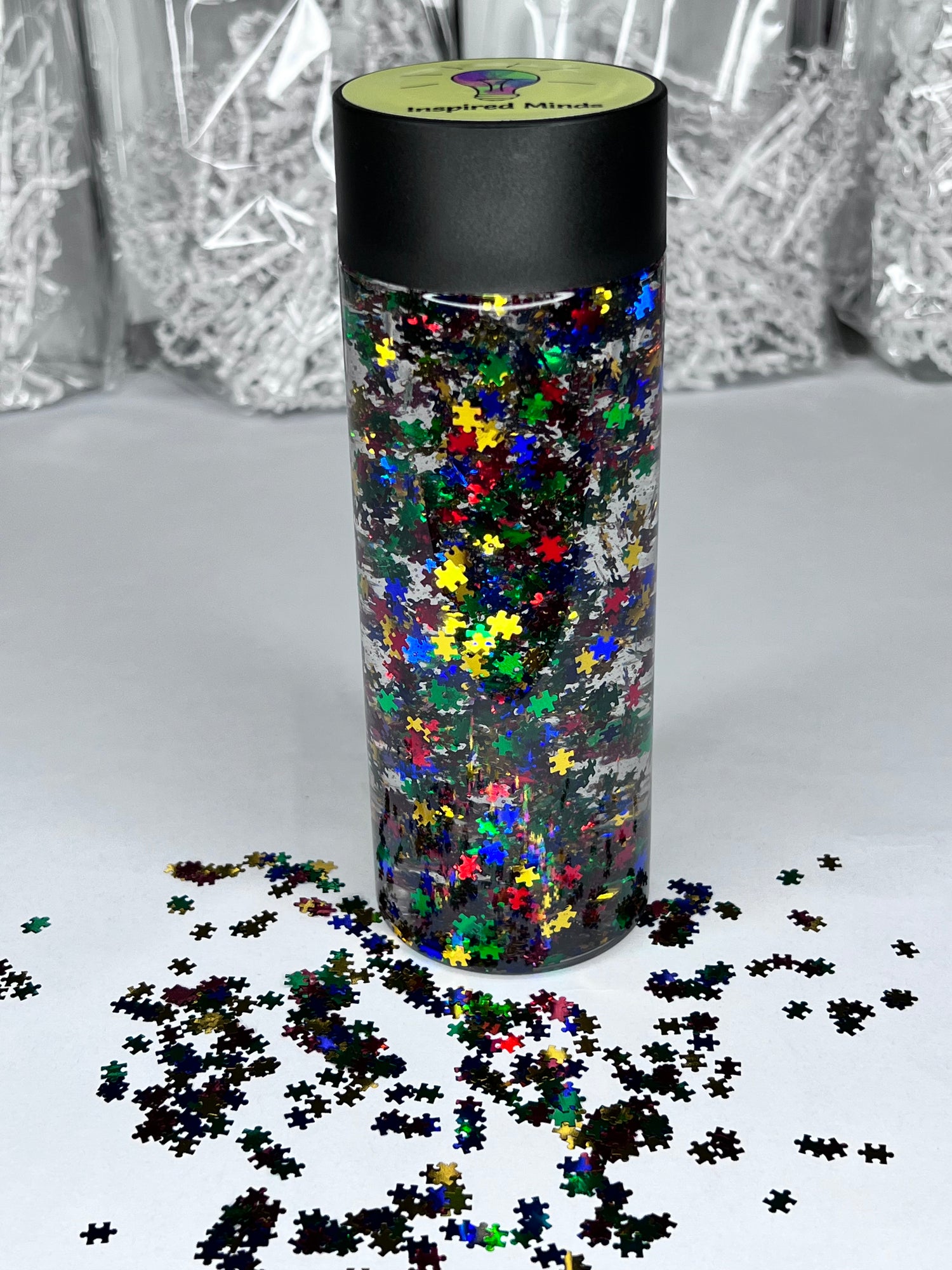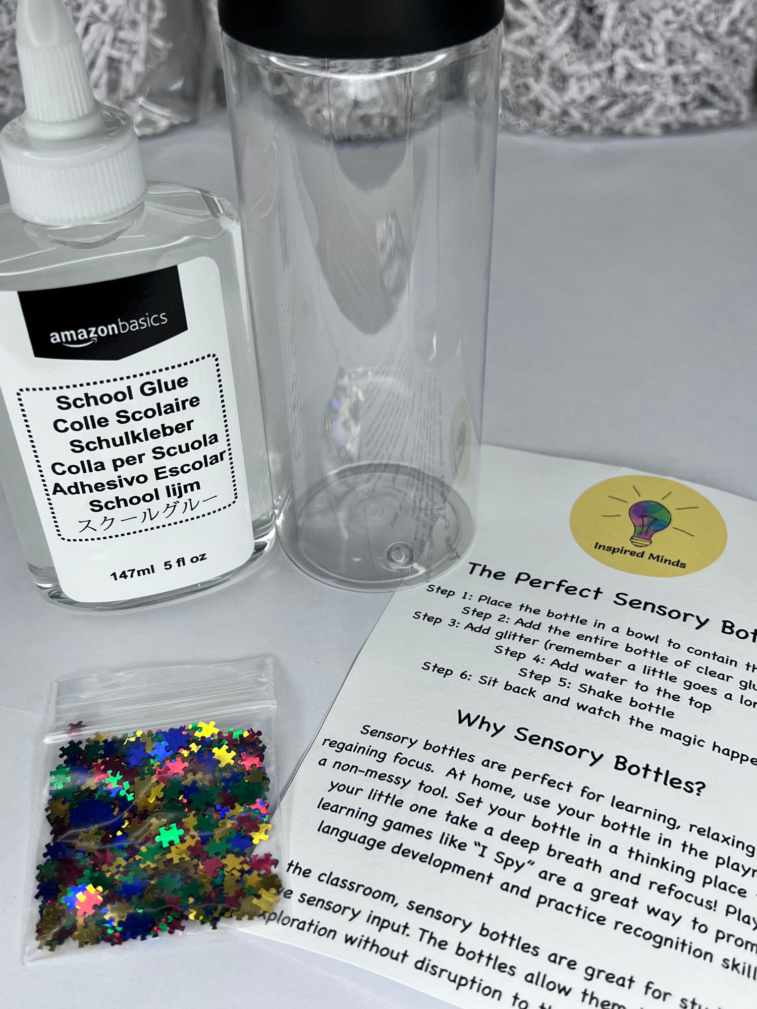 ~To create the perfect sensory bottle, add the whole bottle of clear glue to slow down the flow of your glitter. Next, add as much glitter as you like. Start out with a little bit and add as you go. Finally, top your bottle off with warm water. Shake and be mesmerized!