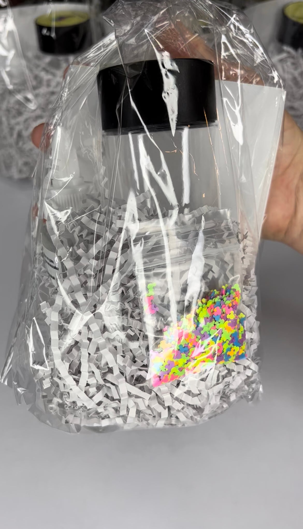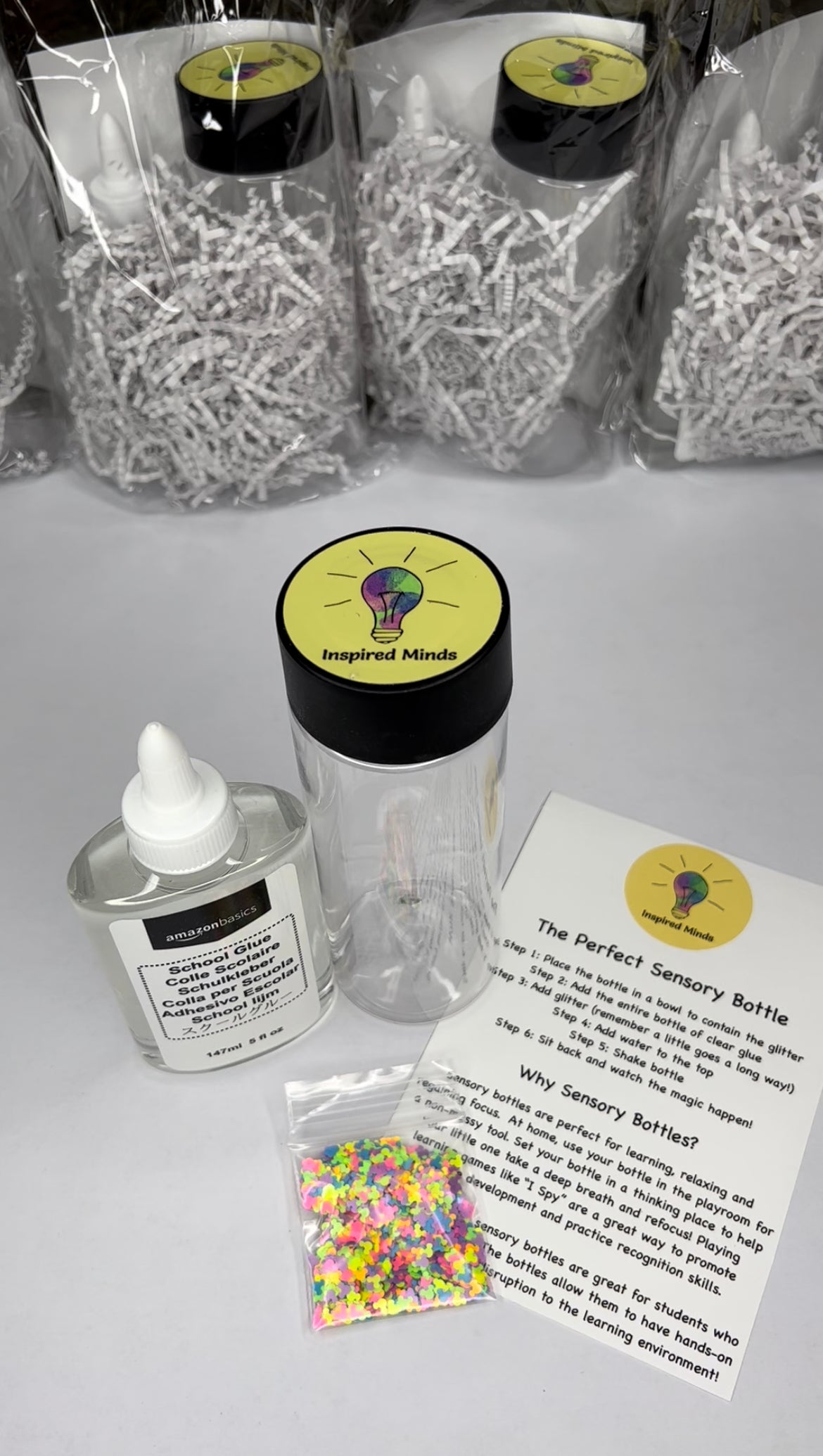 ~To create the perfect sensory bottle, add the whole bottle of clear glue to slow down the flow of your glitter. Next, add as much glitter as you like. Start out with a little bit and add as you go. Finally, top your bottle off with warm water. Shake and be mesmerized!